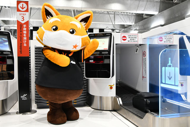 成田空港で自動手荷物預け機にバッグの預け入れを実演するジェットスター・ジャパンのマスコットのジェッ太=20年10月19日 PHOTO: Tadayuki YOSHIKAWA/Aviation Wire