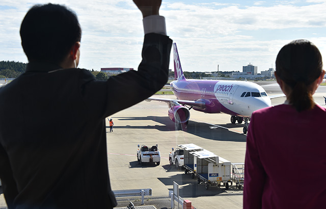 成田空港第1ターミナルを出発する奄美行きMM541便を見送るピーチの森CEO(左)と客室乗務員=20年10月25日 PHOTO: Yusuke KOHASE/Aviation Wire