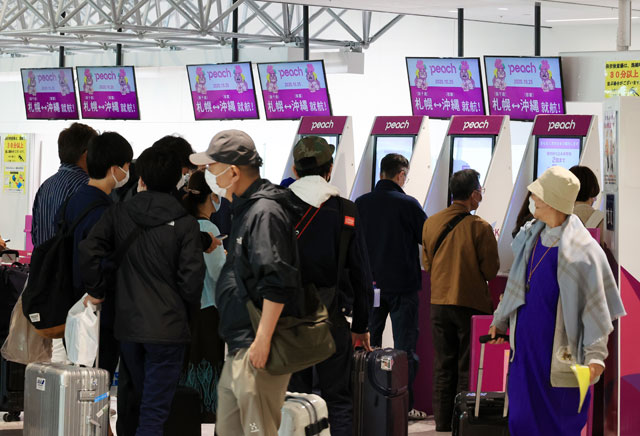 新千歳空港でピーチの那覇行き初便の搭乗手続きをする乗客=20年10月25日 PHOTO: Yoshikazu TSUNO/Aviation Wire