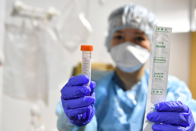 成田空港第2ターミナルに開設されたPCRセンターで検査キットを手にする看護師=20年11月2日 PHOTO: Tadayuki YOSHIKAWA/Aviation Wire