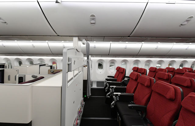 有料で事前指定できるようになったのは、非常口席とエコノミークラス最前列席。国際線用ボーイング787-8型機(E12仕様:2クラス186席)の場合、エコノミー最前列となる18列目8席と、非常口の45列目8席の計16席が対象になる。