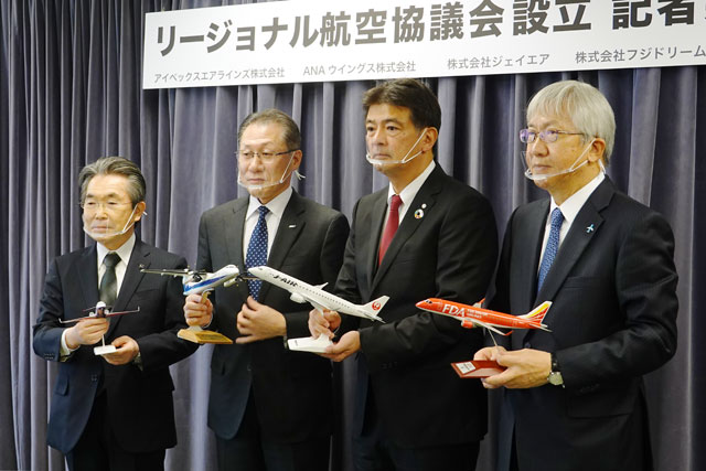 リージョナル航空協議会の設立を発表する(左から)アイベックスエアラインズの浅井社長、ANAウイングスの衛藤社長、ジェイエアの宍倉社長、FDAの楠瀬社長=20年12月1日 PHOTO: Tadayuki YOSHIKAWA/Aviation Wire