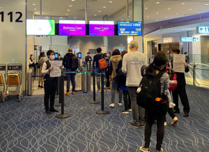 羽田空港でハワイアン航空のホノルル行きHA864便再開初便に搭乗する乗客(同社のTwitterから)
