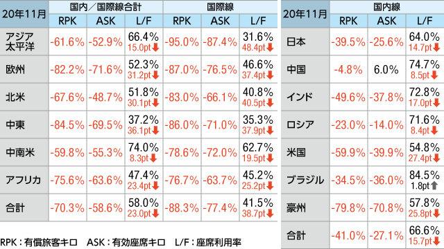 IATA(国際航空運送協会)の2020年11月の世界旅客輸送実績は、国際線と国内線の合計で、有償旅客の輸送距離を示すRPK(有償旅客キロ)は前年同月比70.3%減、座席供給量を示すASK(有効座席キロ)は58.6%減となった。ロードファクター(座席利用率、L/F)は23.0ポイント低下の58.0%。新型コロナウイルスの影響により国際線は大きく落ち込んだものの、各国の国内線は回復傾向が続いている。