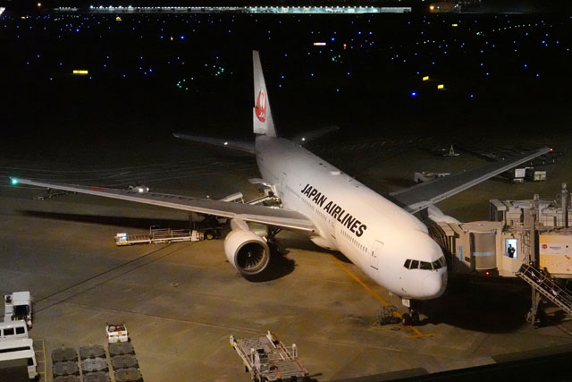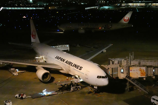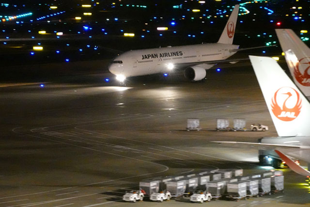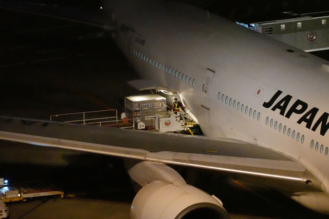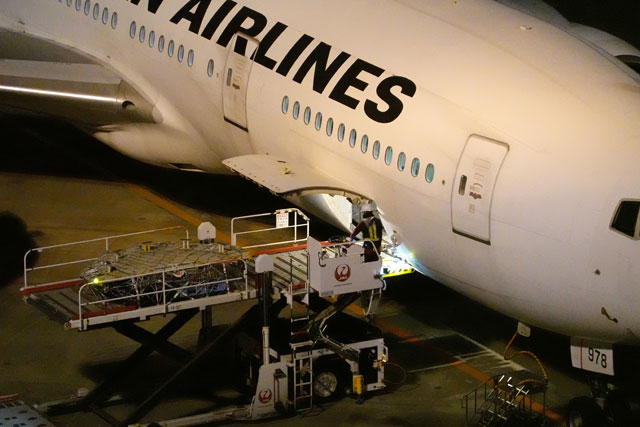 那覇から羽田へ到着し積荷を降ろすJALの777-200 JA8978=21年2月16日 PHOTO: Tadayuki YOSHIKAWA/Aviation Wire