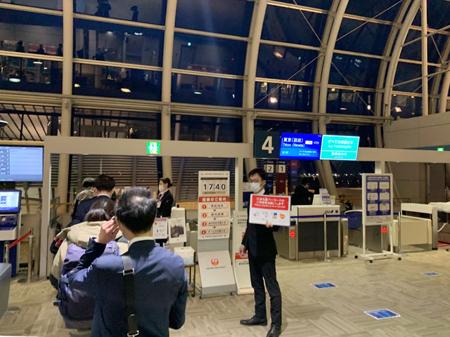羽田行きJL4920便の場合、出発1時間前となる午後5時すぎには長蛇の列ができていた。昼間の混雑時と比べて2倍くらいの人が並んでおり、搭乗手続きの締切時刻である午後5時40分になっても、保安検査場に入れない人が多かった。