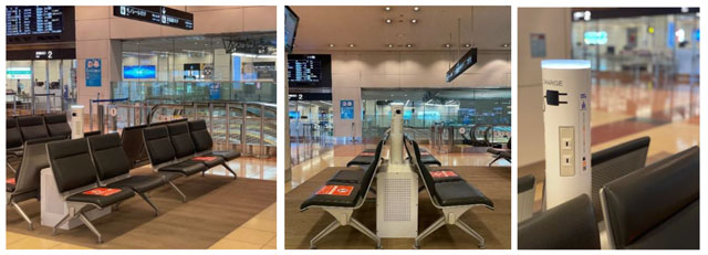 設置場所は、両ターミナルの到着ロビーとゲートラウンジ内で計100カ所。エリーパワー製蓄電池「POWER YIILE 3(パワーイレ・スリー)」を設置し、1カ所当たり充電用USBポートを8つ設ける。