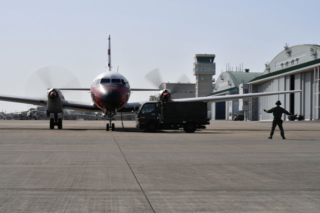 ラストフライトを終えて入間基地の駐機場へ向かうYS-11FC=21年3月17日 PHOTO: Tadayuki YOSHIKAWA/Aviation Wire