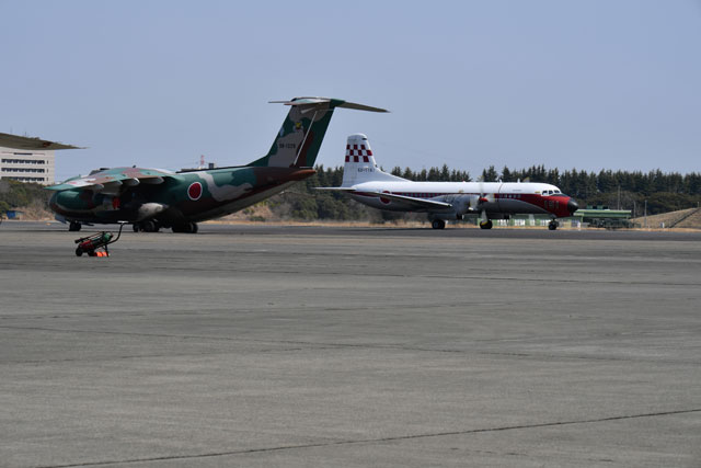 日航製が設計した輸送機C-1の横を通りラストフライトを終えて入間基地の駐機場へ向かうYS-11FC=21年3月17日 PHOTO: Tadayuki YOSHIKAWA/Aviation Wire
