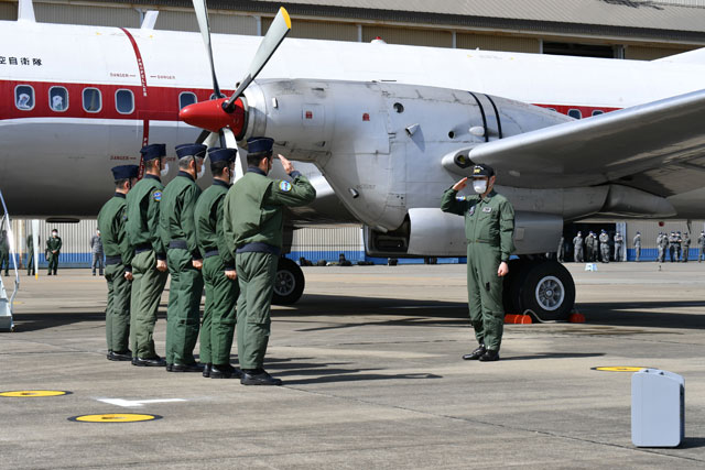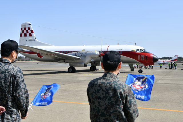 ラストフライトを終えたYS-11FCを出迎える飛行点検隊の隊員=21年3月17日 PHOTO: Tadayuki YOSHIKAWA/Aviation Wire