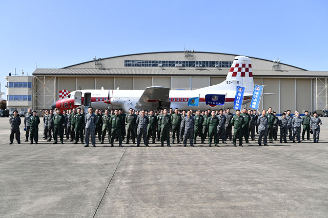 ラストフライトを終えたYS-11FCと記念撮影する飛行点検隊の隊員=21年3月17日 PHOTO: Tadayuki YOSHIKAWA/Aviation Wire