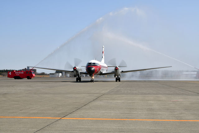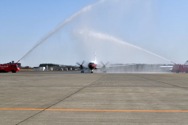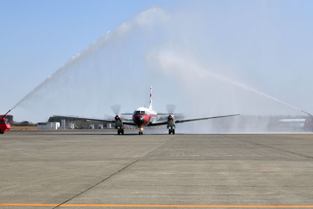 入間基地の消防車による放水アーチをくぐり駐機場に進入するYS-11FC=21年3月17日 PHOTO: Tadayuki YOSHIKAWA/Aviation Wire