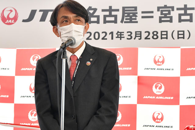 中部空港で開かれた宮古線就航式典であいさつするJTAの青木社長=21年3月28日 PHOTO: Tadayuki YOSHIKAWA/Aviation Wire