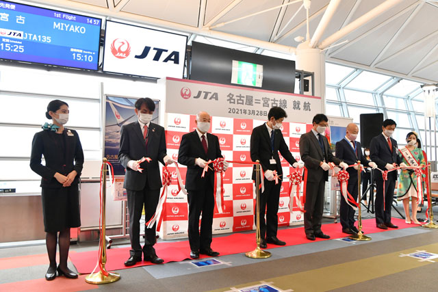 中部空港で開かれた宮古線就航式典でテープカットするJTAの青木社長ら=21年3月28日 PHOTO: Tadayuki YOSHIKAWA/Aviation Wire