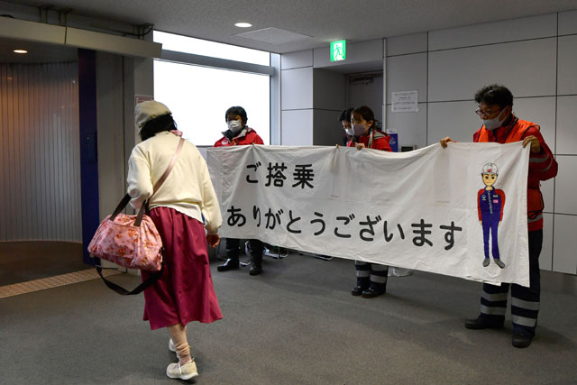 中部から宮古へ到着したNU135便の乗客を横断幕を手に出迎える地元の人々=21年3月28日 PHOTO: Tadayuki YOSHIKAWA/Aviation Wire