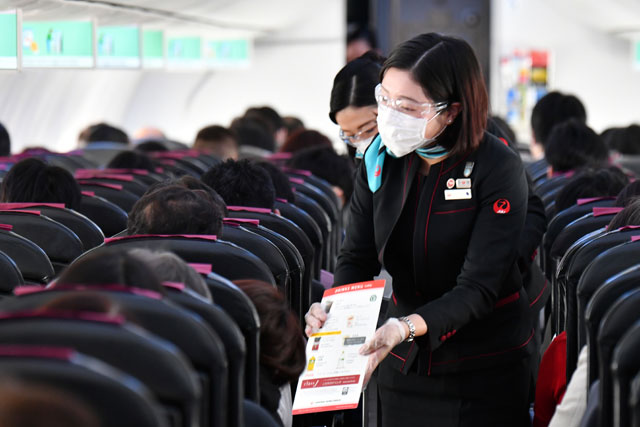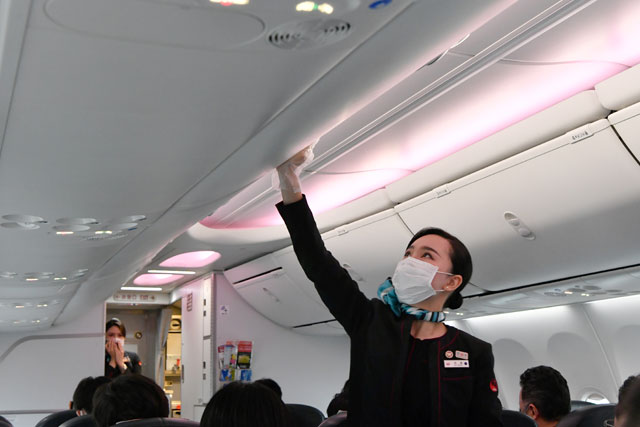 JTAの中部発宮古行き初便NU135便の機内で手荷物収納棚を点検する客室乗務員=21年3月28日 PHOTO: Tadayuki YOSHIKAWA/Aviation Wire