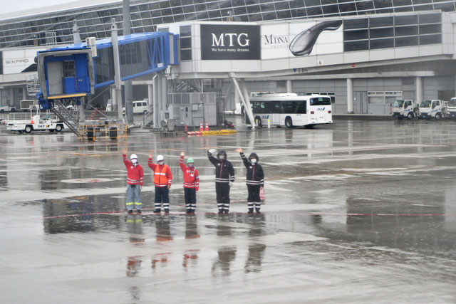 JTAの宮古線就航初便NU135便の乗客を見送る中部空港のスタッフ=21年3月28日 PHOTO: Tadayuki YOSHIKAWA/Aviation Wire