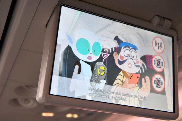 中部発宮古行き初便NU135便の機内で流れる空手をテーマにしたJTAオリジナルの機内安全ビデオ=21年3月28日 PHOTO: Tadayuki YOSHIKAWA/Aviation Wire