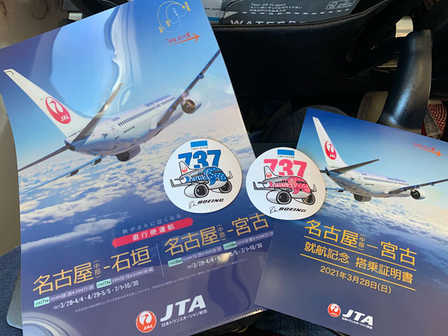 JTAの中部発宮古行き初便NU137便の乗客に配られた搭乗証明書とクリアファイル、シール=21年3月28日 PHOTO: Tadayuki YOSHIKAWA/Aviation Wire
