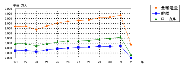 2009年(平成21年)から20年(令和2年)までの国内線旅客数の推移(国交省航空輸送統計から)
