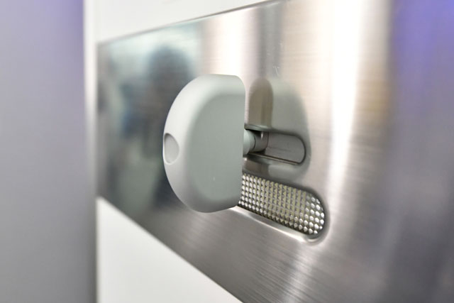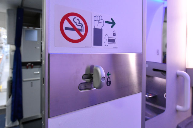 ラバトリーは機内で設置面積が限られているなどの理由もあり、自動ドアを設置するのは難しいといった課題がある中、ANAとジャムコはひじで開けられるドアを昨年試作。ドアの内側に「ひじ」を使って開けるハンドルを追加し、ドアをロックするノブを大型化した。今回公開した787も、既存ラバトリーのドアにハンドルを追加してノブを変更した。
