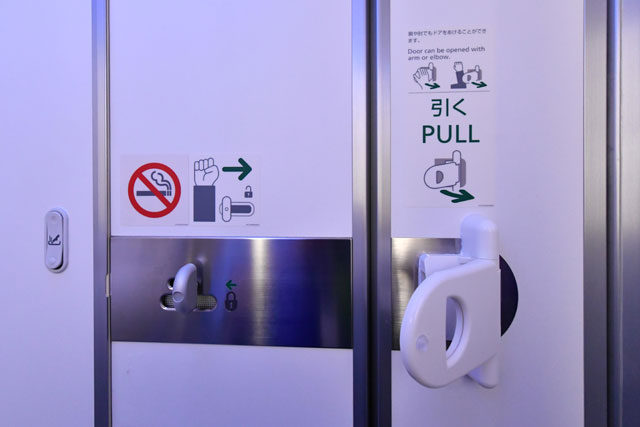 ひじを使って扉を開けられるようにしたANAとジャムコによる非接触ラバトリードア=21年4月28日 PHOTO: Tadayuki YOSHIKAWA/Aviation Wire