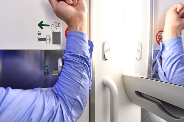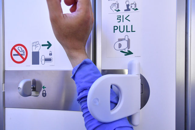 ひじを使って扉をロックするノブを動かせるようにしたANAとジャムコによる非接触ラバトリードア=21年4月28日 PHOTO: Tadayuki YOSHIKAWA/Aviation Wire