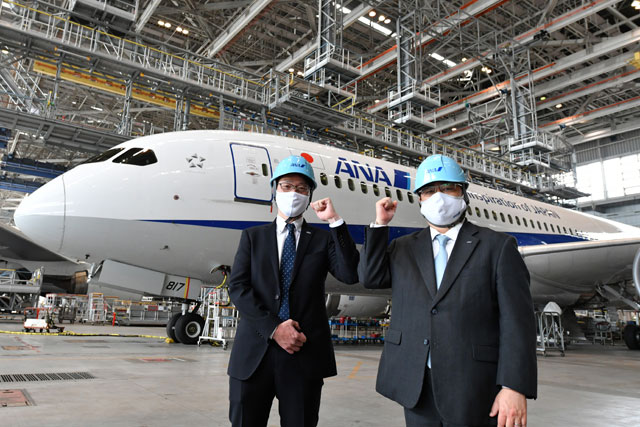 ラバトリーのドアを非接触型に改修した787-8の前でひじでドアを開けるポーズをとるANA CX推進室商品企画部の眞野知彦部長(右)とジャムコ プロダクトイノベーション室の大栗強室長=21年4月28日 PHOTO: Tadayuki YOSHIKAWA/Aviation Wire