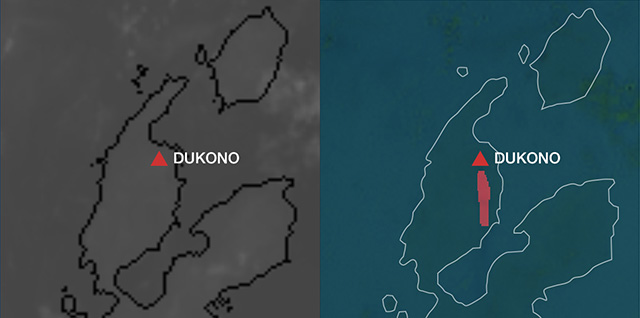 赤く示された「AI火山灰検知システム」により捉えた噴煙(右)。左側の赤外画像では噴煙を確認できない(ウェザーニューズ提供)