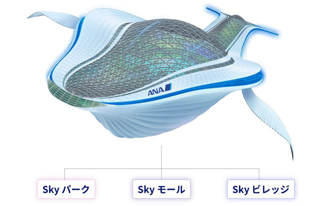 SKY WHALEのコンセプトは「時空を超える旅客機」で、3つのサービスで構成。3D(三次元)CGで描かれた都市や観光名所を最大8人同時に旅行できる「Skyパーク」、空港でのショッピングやエンターテインメントをイメージした「Skyモール」、未来の街をイメージし、バーチャル上での医療や教育、行政などのサービスを提供する「Skyビレッジ」を用意する。
