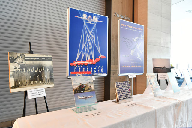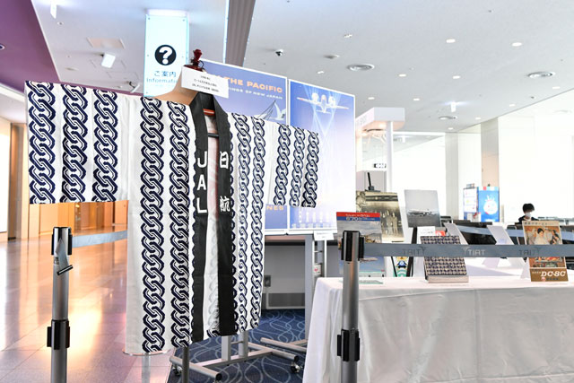 羽田空港の112番搭乗口前に展示されたJALの羽田-パリ・ロンドン線就航当時のポスターやはっぴ=21年6月6日 PHOTO: Tadayuki YOSHIKAWA/Aviation Wire