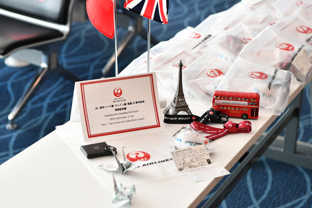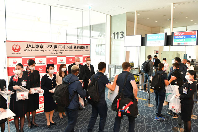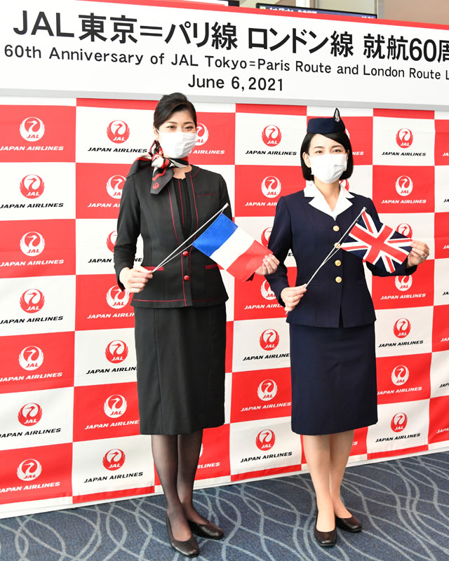 日本航空(JAL/JL、9201)は6月6日、東京-ロンドン線とパリ線の就航60周年記念式典を羽田空港第3(旧称国際線)ターミナルで開いた。新型コロナウイルス感染症(COVID-19)の影響で乗客数は両路線とも50人を下回ったが、就航当時の3代目制服を着用した客室乗務員や現行制服の地上係員らが乗客に記念品を手渡した。