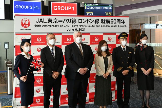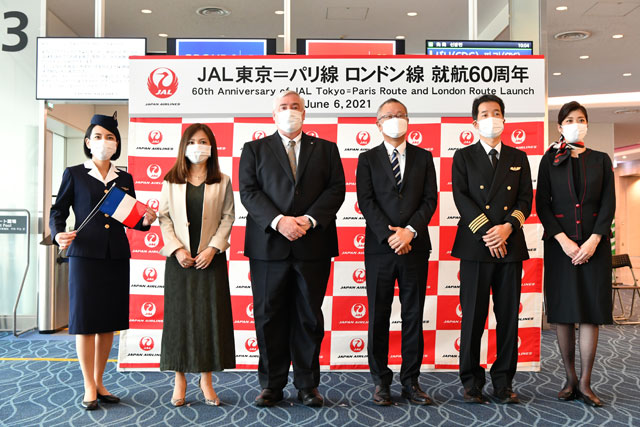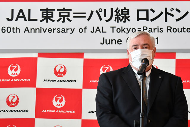 羽田で開かれた記念式典で、JALの執行役員で路線事業本部副本部長を務めるレゲット・ロス氏は、「パリ線とロンドン線が就航60周年を迎えられたが、創立70周年の節目の年でもあり、公共交通機関としての責務を果たす。一日も早く以前のように過ごせるようになって欲しい」とあいさつした。