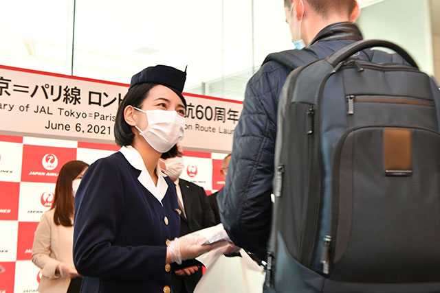 羽田空港でパリ線就航60周年の記念品をパリ行きJL45便の乗客に手渡す3代目制服を着用したJALの客室乗務員=21年6月6日 PHOTO: Tadayuki YOSHIKAWA/Aviation Wire