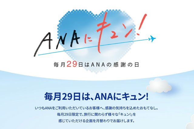 全日本空輸(ANA/NH)は6月25日、毎月29日限定で航空券のセールなどを実施するキャンペーン「ANAにキュン!」を開催すると発表した。ANAによると「全日空」の「にっくう」と「29」の語呂合わせと、月末に予約が多く入る傾向にあることから、29日に実施することにしたという。ANAが毎月決まった日にキャンペーンを実施するのは初めて。