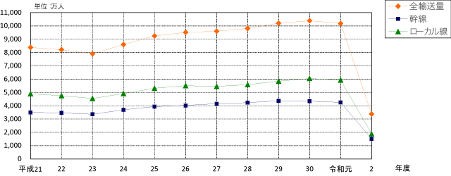 09年度(平成21年度)から20年度(令和2年度)までの国内線旅客数の推移(国交省航空輸送統計から)