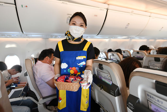 那覇へ向かうピカチュウジェットBC初便で機内サービスするスカイマークの客室乗務員=21年6月21日 PHOTO: Tadayuki YOSHIKAWA/Aviation Wire