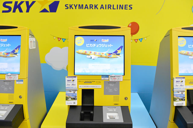 到着地の那覇空港では、手荷物を受け取るターンテーブルにもピカチュウが表われ、チェックインカウンターもピカチュウで装飾していた。また、自動チェックイン機や搭乗券、手荷物タグはスカイマークが就航するすべての空港でピカチュウ仕様になっており、搭乗券のデザインは15種類用意した。