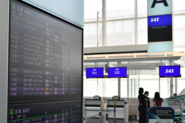 羽田空港第3ターミナルのスカンジナビア航空コペンハーゲン行きの出発案内とチェックインカウンター=21年7月12日 PHOTO: Tadayuki YOSHIKAWA/Aviation Wire