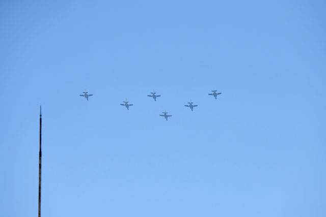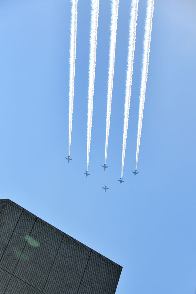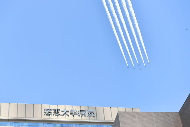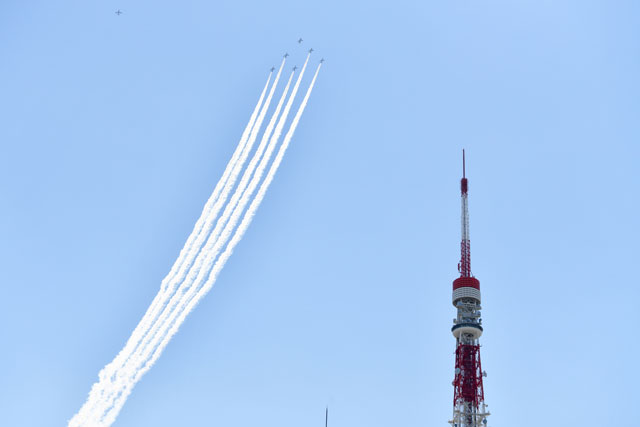21日は午後0時20分ごろ離陸し、東京タワー付近では午後0時40分ごろ、先導する1機を除く5機が白いスモークで5本の線を描きながら飛行する姿がみられた。