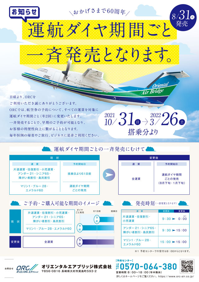 オリエンタルエアブリッジ(ORC/OC)は、これまで一部運賃を除き搭乗61日前から受け付けていた航空券の予約を、10月31日開始の冬ダイヤ分から年2回ある運航ダイヤの変わり目ごとに改める。冬ダイヤ分は8月31日から販売し、早期に予約できるようにすることで利便性を高める。