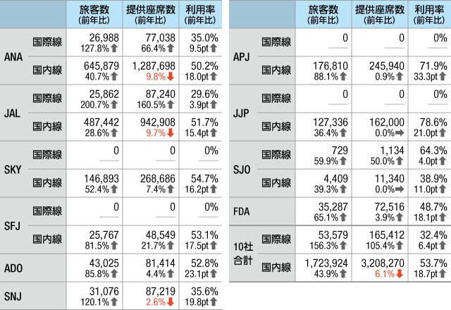 10社の発表値を合計すると、旅客数は国際線が前年同期比2.56倍の5万3579人、国内線は43.9%増の172万3924人。提供座席数は国際線が2.05倍の16万5412席で、国内線は6.1%減の320万8270席となった。10社平均のロードファクター(座席利用率、L/F)は国際線が6.4ポイント上昇し32.4%、国内線は18.7ポイント上昇し53.7%だった。