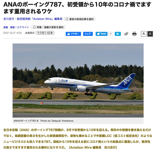 私が執筆する中での第1回(連載としては通算3回目)は、全日本空輸(ANA/NH)のボーイング787型機が9月で初受領から10年を迎えることから、787のこれまでとこれからをまとめました。