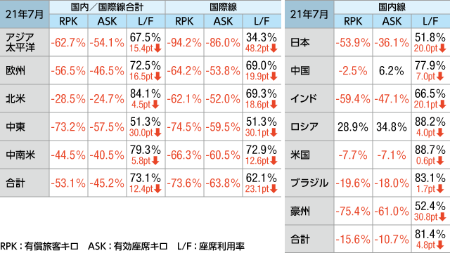 IATA(国際航空運送協会)の2021年7月世界旅客輸送実績によると、国際線と国内線の合計は、有償旅客の輸送距離を示すRPK(有償旅客キロ)が新型コロナウイルス感染症(COVID-19)前の2019年同月と比較し53.1%減、座席供給量を示すASK(有効座席キロ)は45.2%減となった。ロードファクター(座席利用率、L/F)は12.4ポイント低下の73.1%だった。