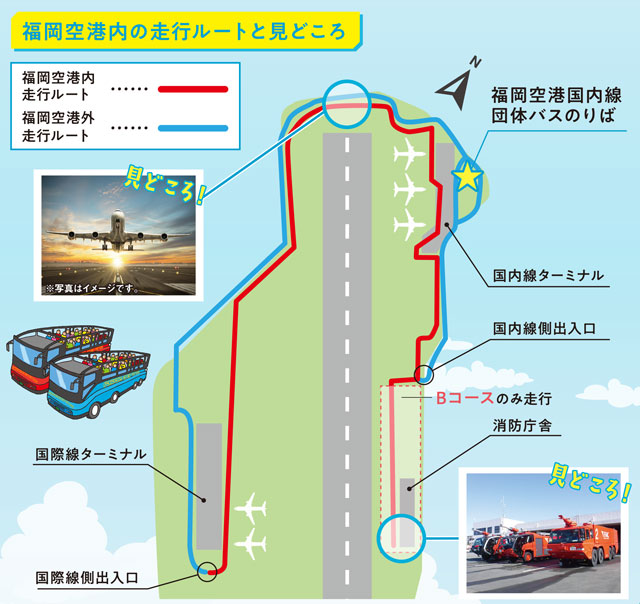 Aコースは天神を午前中に出発し、福岡空港内を走行後は国内線団体バスのりばで下車することも可能。福岡空港発着のBコースは、空港東側の消防庁舎までバスが走行し、空港用化学消防車を見学でき、AコースとCコースとは異なる見学ルートになる。Cコースは空港内の夜景を楽しめ、国内線団体バスのりばでも下車できる。