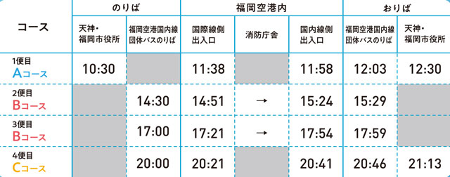 運行コースは3種類。天神・福岡市役所前を午前10時30分に出発し、午後0時30分に戻るAコース、福岡空港国内線団体バスのりばを午後2時30分と午後5時に出発し、同のりばに戻るBコース、同のりばを午後8時に出発し、空港内を走行後は天神・福岡市役所前に午後9時13分に着くCコースがある。
