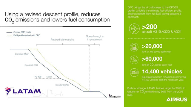 航空機の飛行経路の最適化は、管制官とともに効率をさらに高めるための重要な要素の一つと位置づけており、ラタム航空はDPO機能により航空機の降下ルートを最適化し、降下時にもっとも低いアイドル推力設定からエンジンへの燃料供給量を削減することで、リマやサンティアゴ、サンパウロなど制約のある空港を含む路線網全体で、航空機1機あたり年間100トン以上の燃料削減を実現するという。1機あたり年間300トン以上のCO2排出量が削減され、ラタム航空のA320ファミリー全機で年間6万トンのCO2を削減できるとしている。