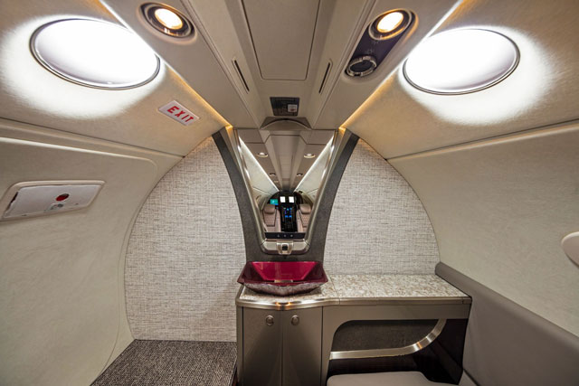 乗客は最大8人で、航続距離は2165マイル(約4010キロ)。国土交通省航空局(JCAB)の型式証明は2011年に取得済みで、月内に内装承認を取得する見通し。従来の客室仕様と比べ、新しいシートオプションや照明などを見直している。