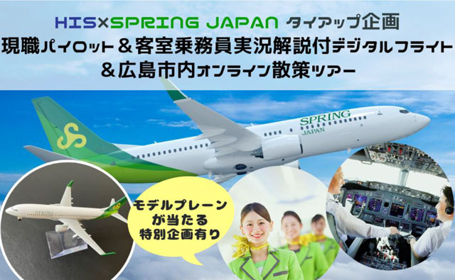春秋航空日本(SPRING JAPAN、SJO/IJ)とエイチ・アイ・エス(HIS、9603)は、オンラインツアー「現職パイロット&客室乗務員の実況解説付きデジタルフライト&広島市内オンライン散策ツアー」の販売を9月24日から始めた。10月9日に開催する。