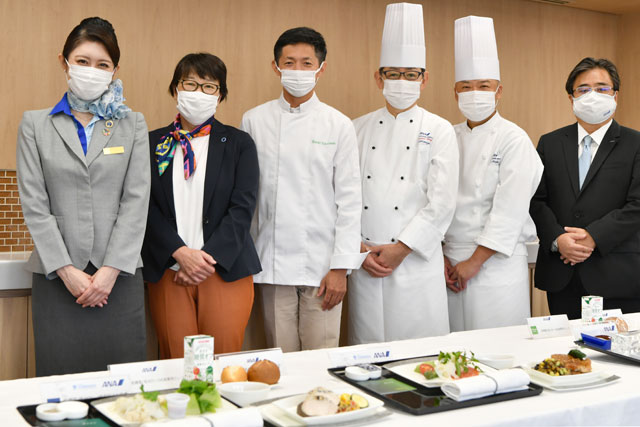 ANAの低糖質・低脂肪・低カロリーと低塩機内食を発表する髙山シェフ(中央左)とANACの清水総料理長(同右)ら=21年9月27日 PHOTO: Tadayuki YOSHIKAWA/Aviation Wire
